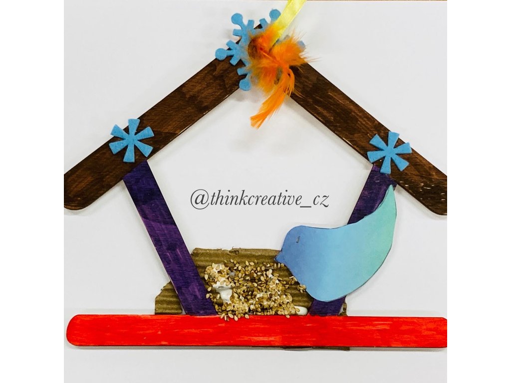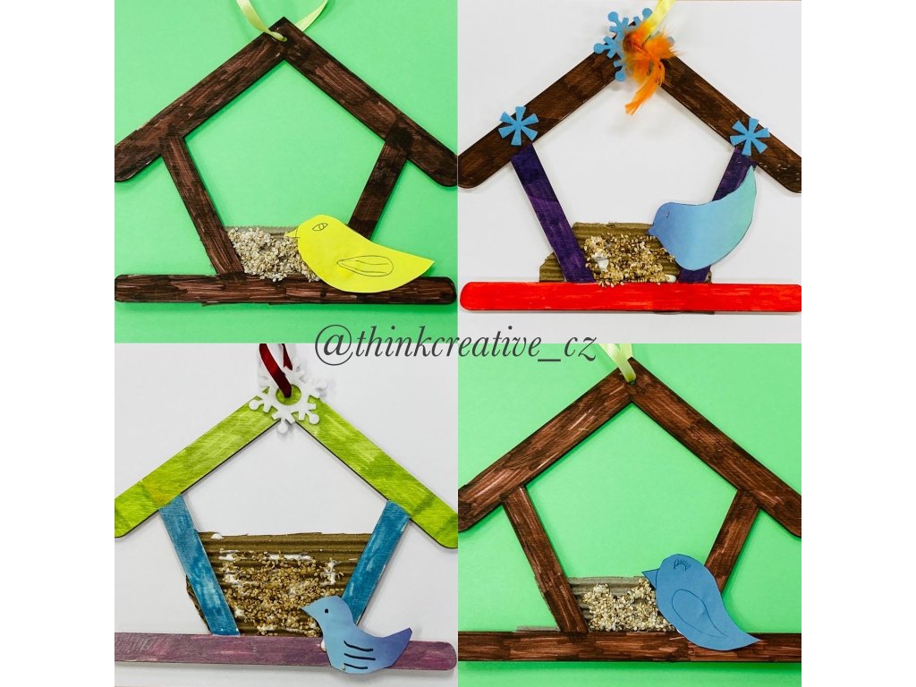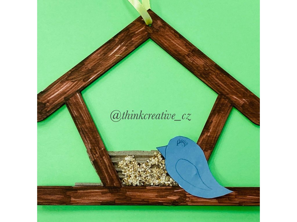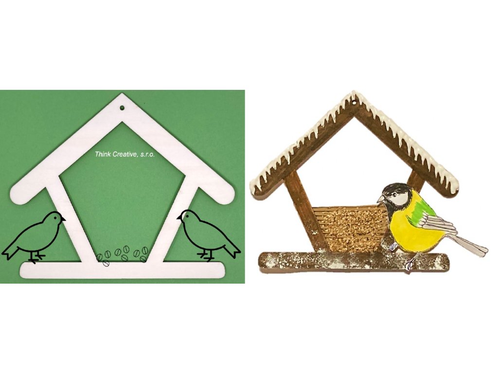 Tento dřevěný výřez může sloužit ke 3 účelům: jako krmítko pro ptáčky, jesličky na betlém nebo jako krmelec pro zvěř. Konstrukci vybarví děti hnědou akrylovou barvou a dolepí dle účelu - ptáčky a semínka, lýko jako seno a lesní zvířátka nebo Ježíška a postavy z Betléma...