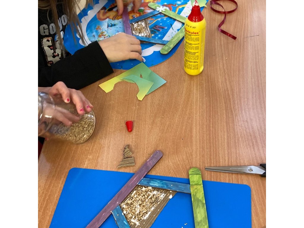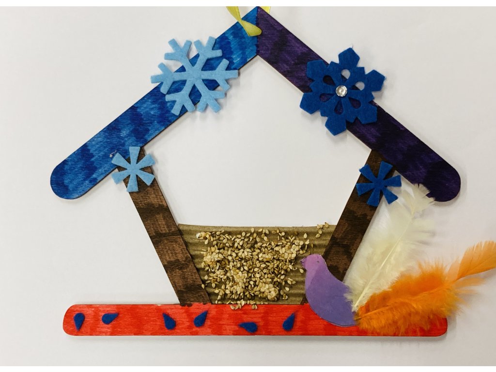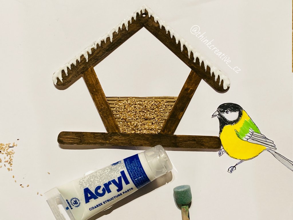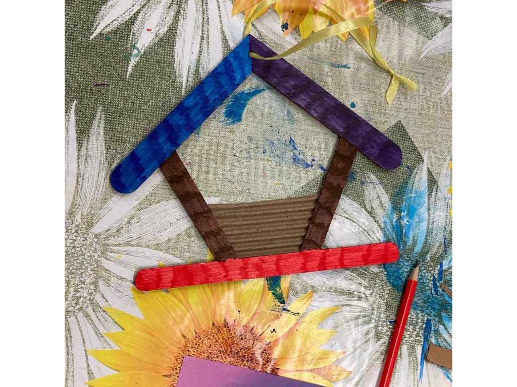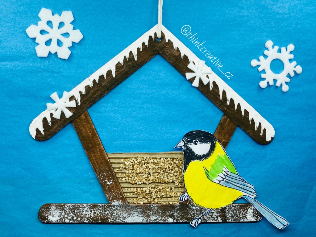 Tento dřevěný výřez může sloužit ke 3 účelům: jako krmítko pro ptáčky, jesličky na betlém nebo jako krmelec pro zvěř. Konstrukci vybarví děti hnědou akrylovou barvou a dolepí dle účelu - ptáčky a semínka, lýko jako seno a lesní zvířátka nebo Ježíška a postavy z Betléma...