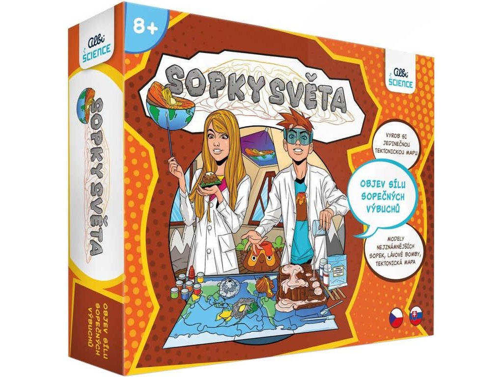Sada Sopky světa obsahuje: jedlou sodu (hydrogenuhličitan sodný) 50 g, kyselinu citronovou 20 g, kádinku, 5 dřevěných tyček na míchání, sádru 430 g, pipetu, lžíci, tekuté barvivo 5 ml, 2 naběračky, štětec, 6 akrylových barev, lepicí polštářky, tektonické puzzle, formu na sopky, sopečný ostrov, návod.