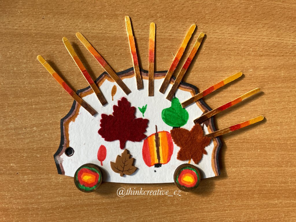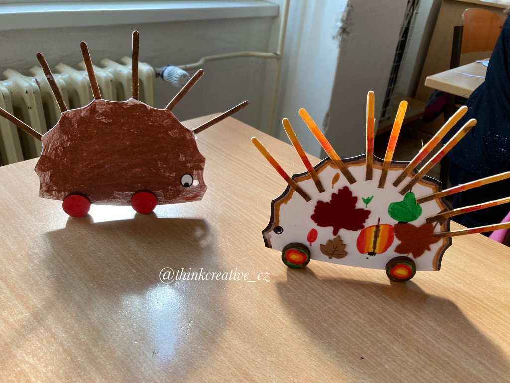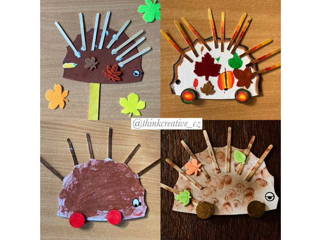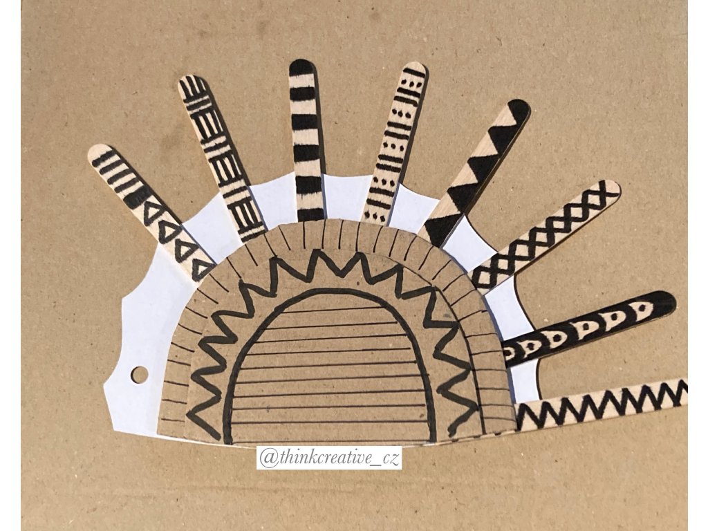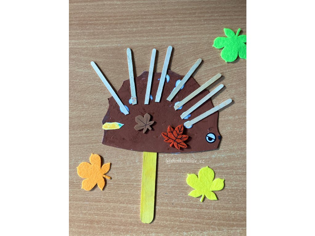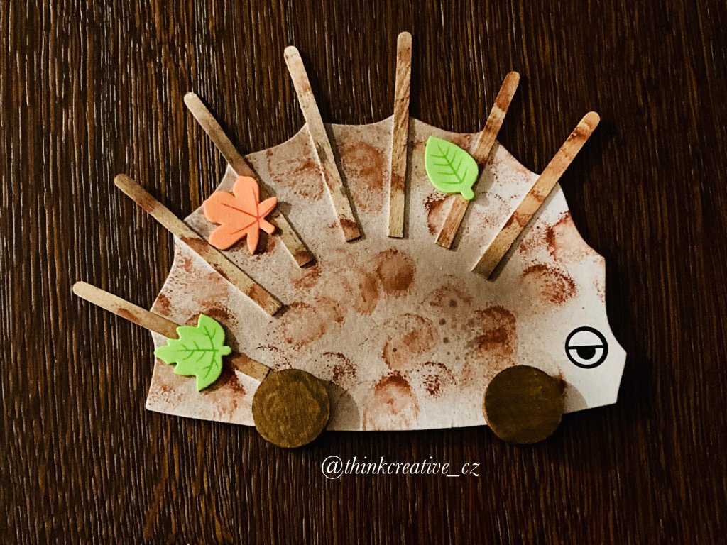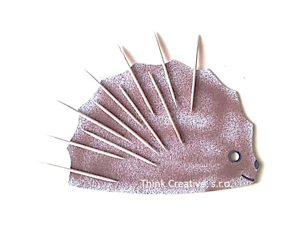 Malý kartonový výřez ježka s dírkou na oko. Stačí vybarvit a dolepit párátka jako bodliny.