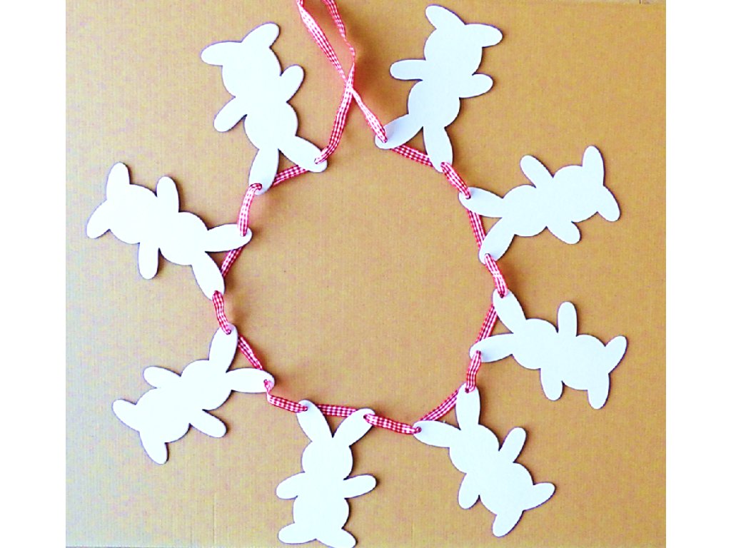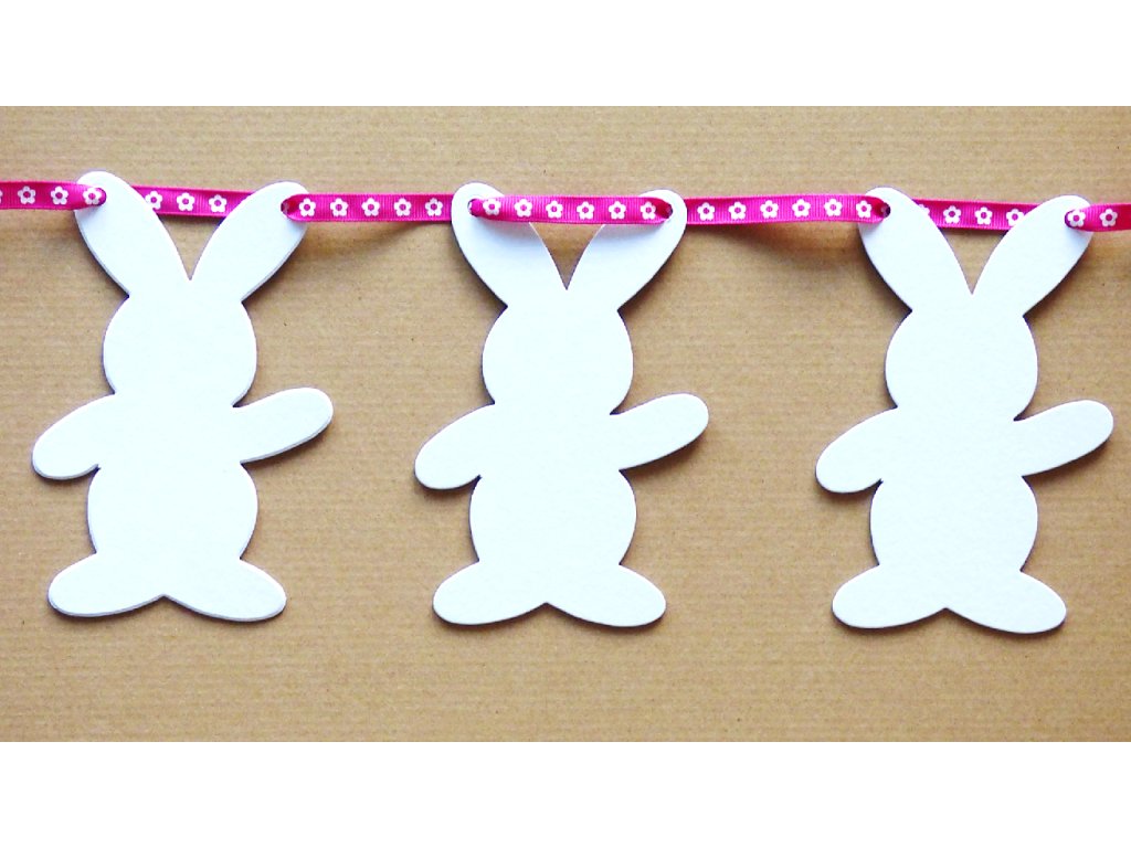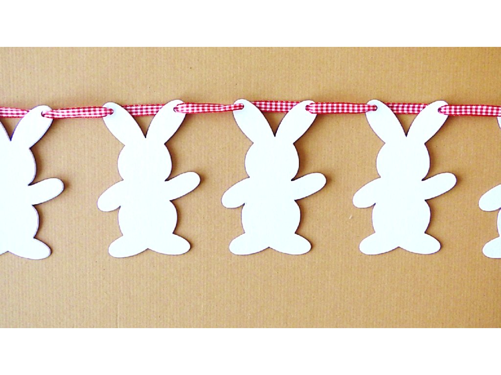 Girlanda obsahuje 8 zajíčků vel. 16 cm a stuhu v délce 3 m. Zajíčci jsou vyrobeni z tuhého oboustranně bílého kartonu. Barva stuhy je dána výrobcem, do poznamky lze napsat, zda jde o variantu pro chlapce či pro děvče.