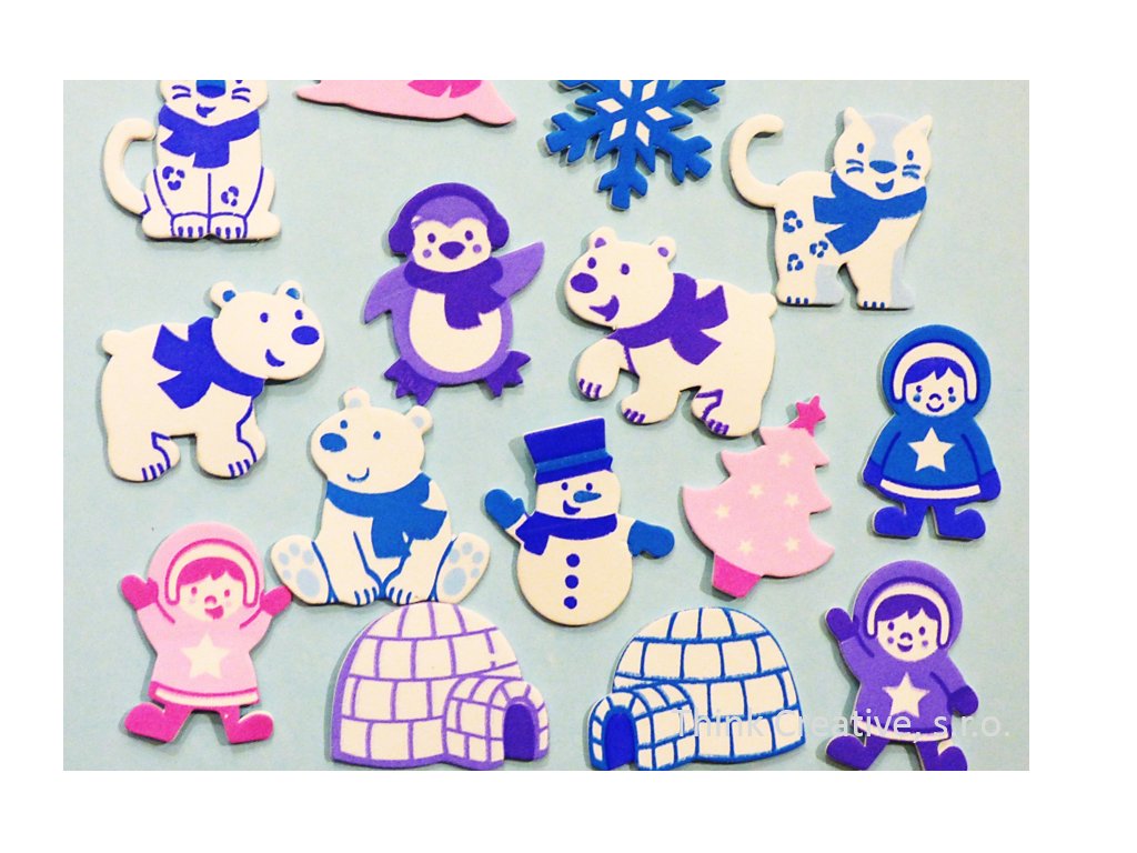 Balení obsahuje 120 ks, 30 různých vzorů - sněhulák, tučňák, lední medvěd, eskymák, tulení mládě, iglů, bílý leopard, vločky, vánoční strom a další.