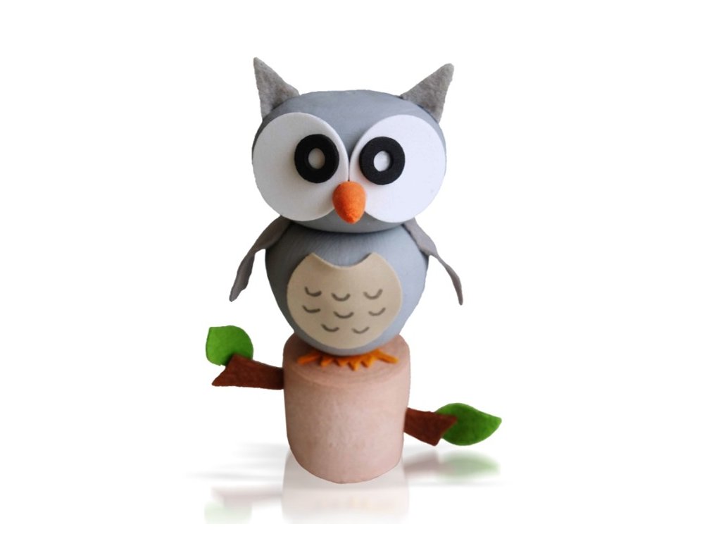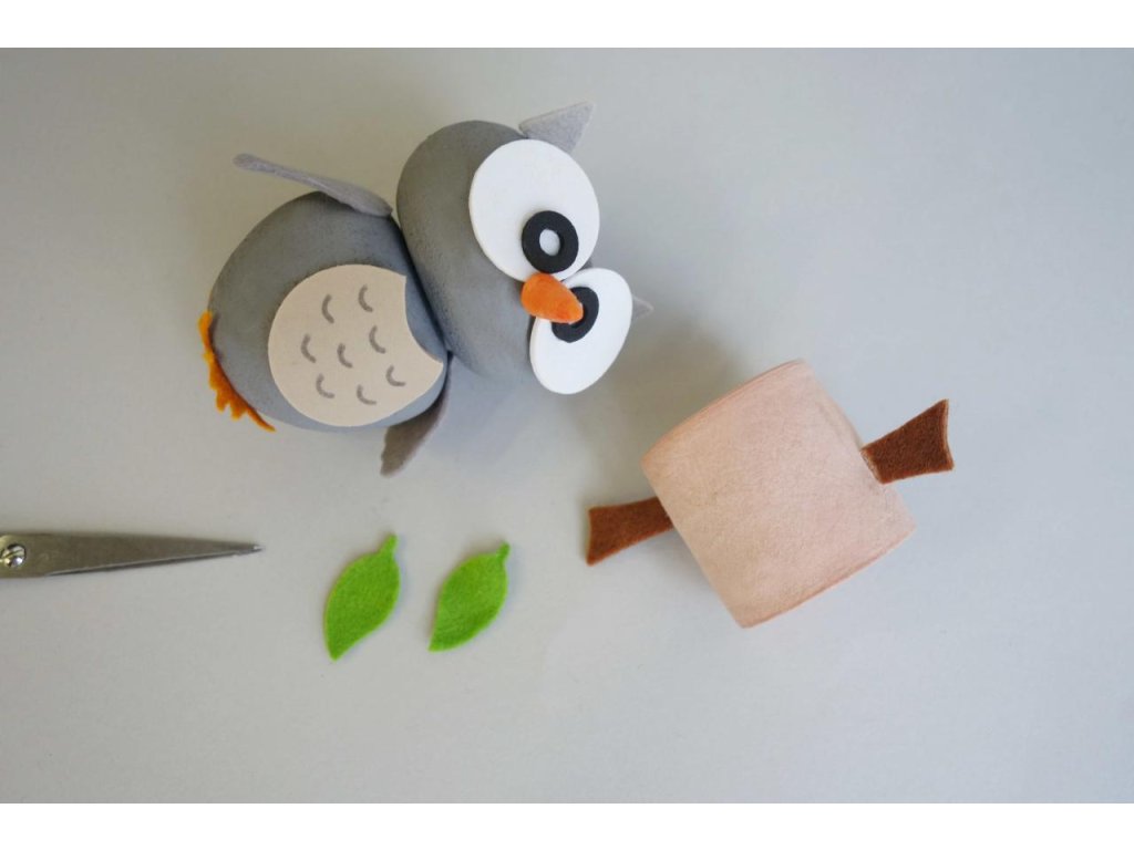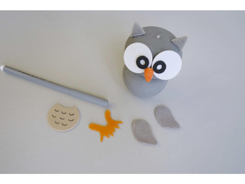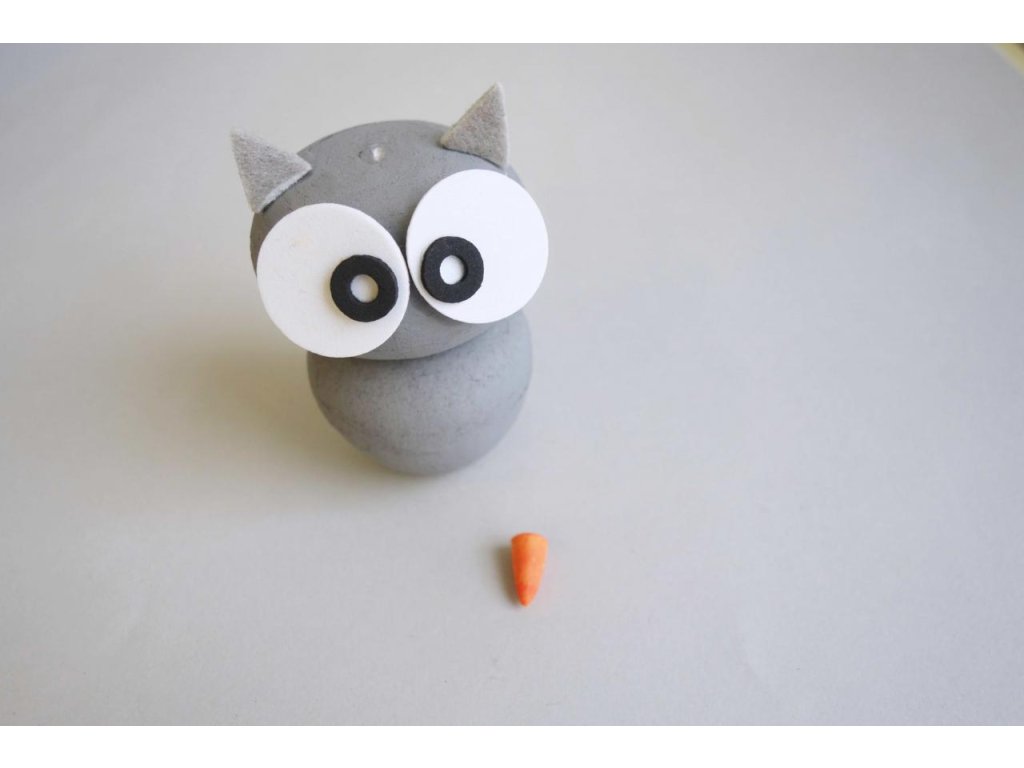 1. Hlavičku přilepíme k tělu, na hlavičku uši, oči a zobáček.